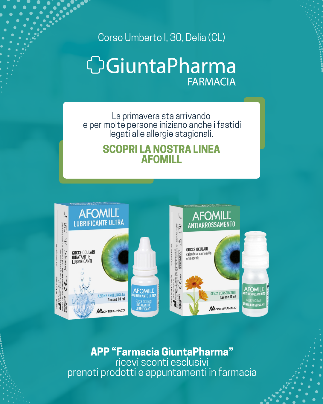 • Afomill Allergy: gocce oculari con estratto di Perilla frutescens + acido ialuronico, soluzione sterile senza conservanti, pensata per attenuare arrossamento e irritazione da allergeni e fattori ambientali.
